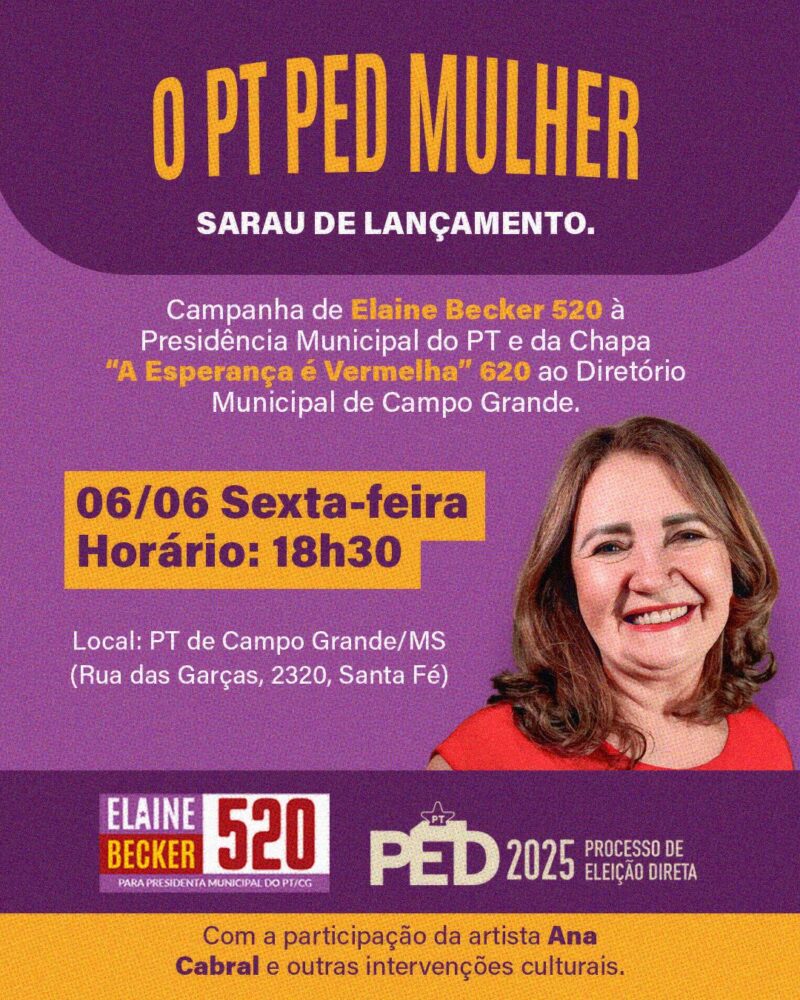 Ocorre nesta sexta-feira (6), a partir das 18h30, o sarau “PT PED Mulher”, que celebra o lançamento da candidatura da ex-vereadora Elaine Becker à presidência do PT em Campo Grande. O evento conta com apresentação da cantora Ana Cabral e exposições artísticas.